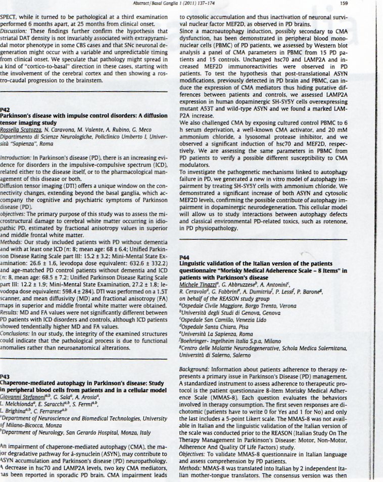 Stefanoni, G., Sala, G., Arosio, A., Melchionda, L., Saracchi, E., Fermi, S., et al. (2011). Chaperone mediated autophagy in Parkinson's disease: Study in peripheral blood cells from patients and in a cellular model. Intervento presentato a: XXXVIII National Congress of the Italian Society for the Study of Parkinson Disease, Extrapyramidal Diseases and Dementia (LIMPE), Venezia Lido.